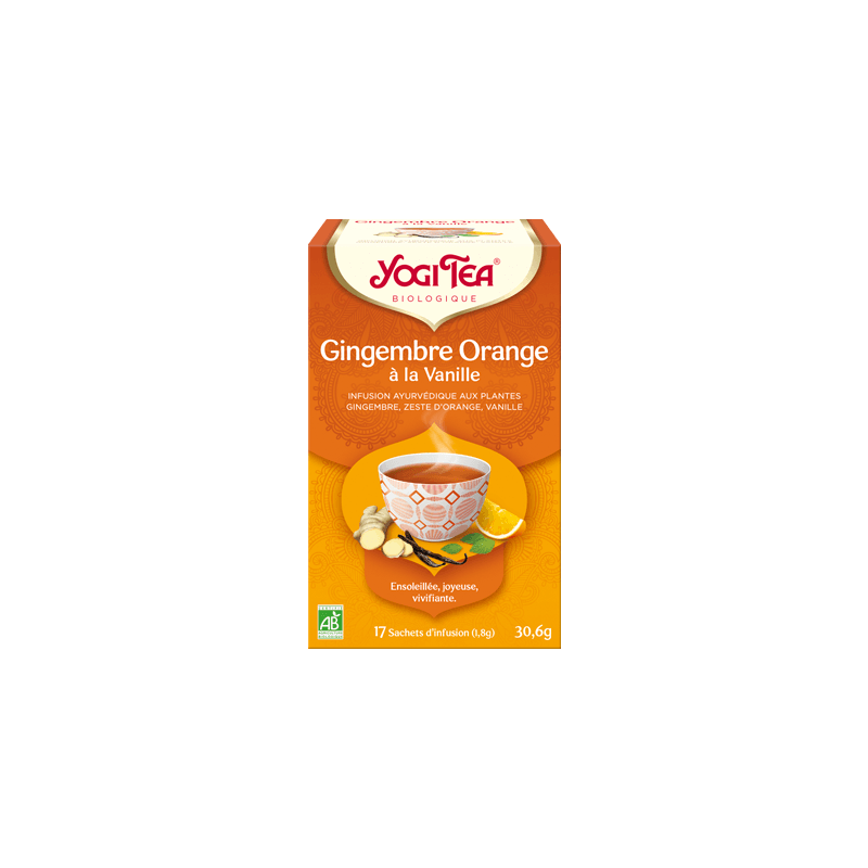Gingembre* (44%), réglisse*, citronnelle*, poivre noir*, zeste d'orange* (4%), menthe poivrée*, extrait de vanille* (3%), extrait d'orange,