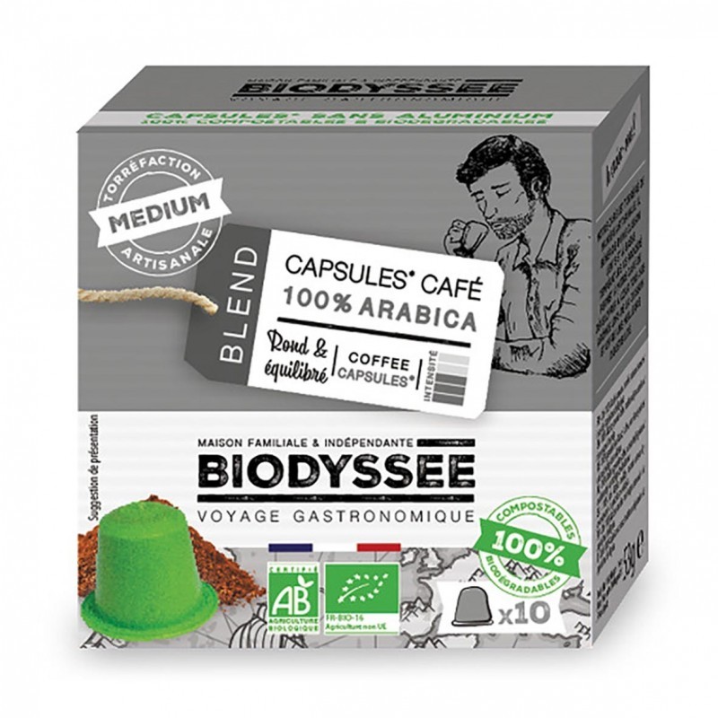 Découvrez ce délicieux café en capsule 100% arabica médium, compatible NESPRESSO bio de la marque Biodyssée.