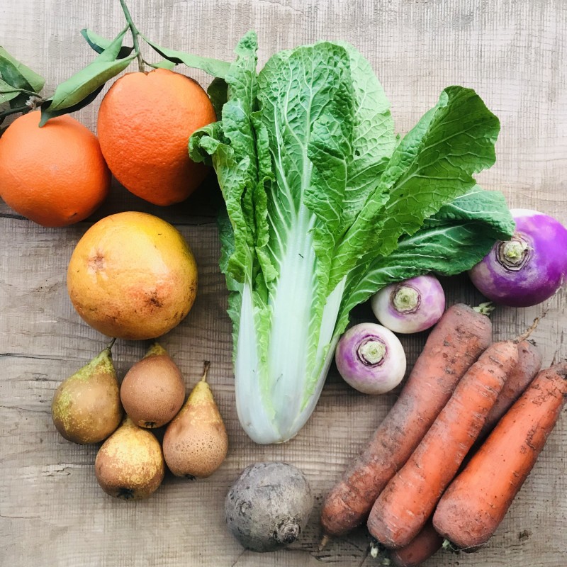 Le panier est composé d'un assortiment de fruits et légumes de saison qui change chaque semaine. Semaine du 08/02 au 13/02 Chou Chinois Carotte Navet Betterave Poire Orange et Pamplemousse